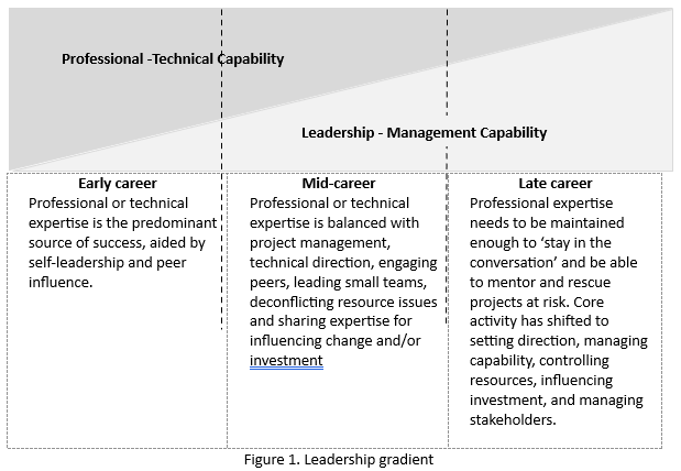 Observation. While many of these needs are shared by managers of all backgrounds, managers from professional backgrounds typically advance to mid-career on their specialist skills, ownership of the business or their record of revenue generation. The transition from specialist competence to leading others often surfaces a skill gap or challenge at mid to late career, at a point where managing talent and teams are either a differentiator or multiplier for success. This gradient is summarised in Figure 1.